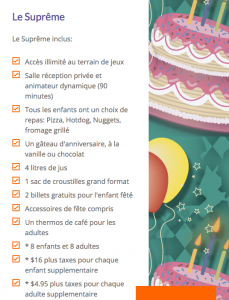 - Tous les enfants reçoivent un repas avec un choix de: Pizza, Hot-dog, Nuggets, sandwich au fromage Grillé
